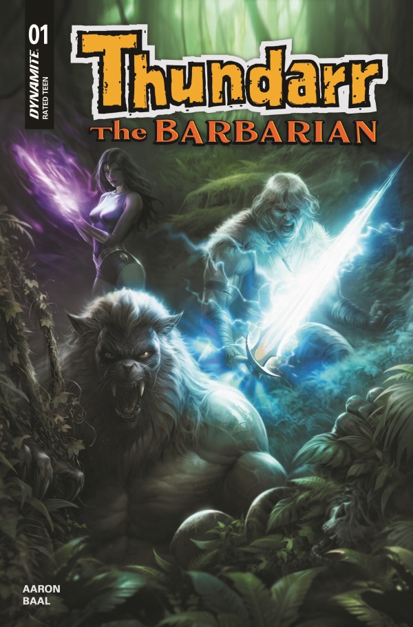 – In the year 1994, from outer space comes a runaway planet hurtling between the Earth and the Moon unleashing cosmic destruction! Man’s civilization is cast into ruin! Two thousand years later, Earth is reborn! A strange new world rises from the old, a world of savagery, super-science, and sorcery! But one man bursts his bonds to fight for justice! With his companions OOKLA THE MOK and PRINCESS ARIEL, he puts his strength, his courage, and his fabulous SUN SWORD against the forces of evil! He is THUNDARR THE BARBARIAN! Join trusted writer JASON AARON as he redefines a classic cartoon concept for today!